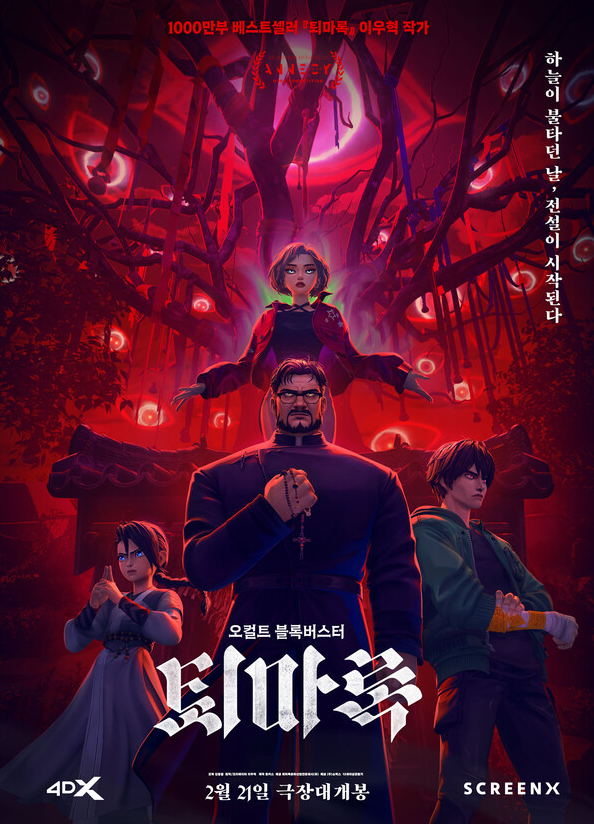 2025년 2월 21일 개봉한 애니메이션 영화 《퇴마록: 엑소시즘 크로니클스 더 비기닝》은 원작 이우혁의 소설 ‘하늘이 불타던 날’을 바탕으로, 절대 악을 쫓는 네 명의 퇴마사들의 이야기다. 파문당한 천주교 신부 박윤규(박신부), 주화입마에 걸린 무공 고수 이현암, 예언의 능력을 지닌 소년 장준후, 그리고 염력과 투시능력을 지닌 고고학도 현승희가 한 팀이 되어 수백 년간 침묵하던 해동밀교의 145대 교주가 펼치는 인류를 제물로 바친 어둠의 의식을 저지하려 한다. 이들은 기독교와 불교, 토속 주술이 교차하는 혼돈의 세계에서 힘을 모아 악의 근원을 파헤치며 본격적인 운명의 서막을 연다.